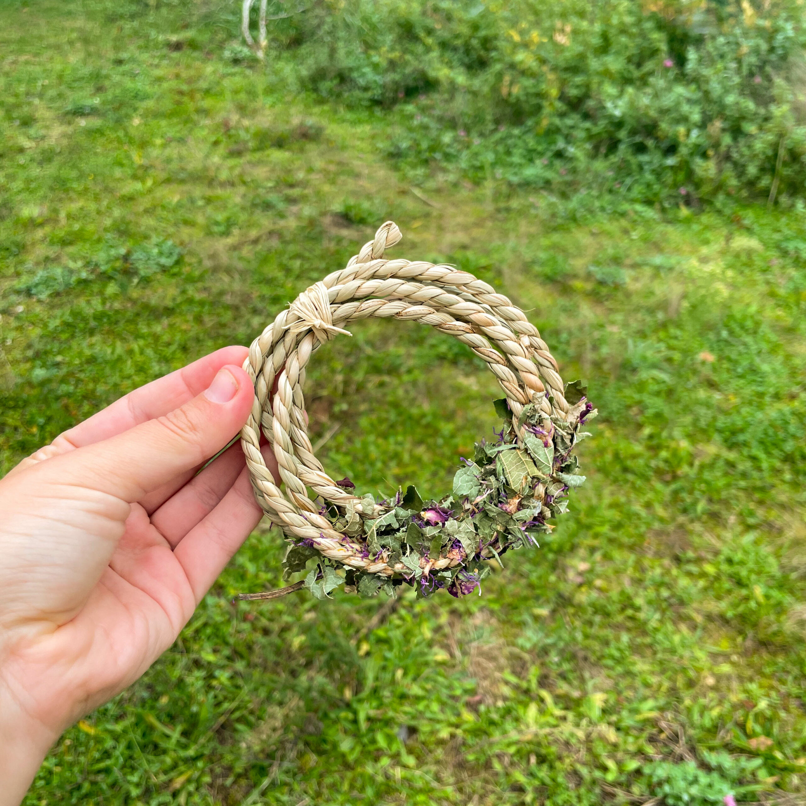 Jouet à grignoter en totalité recouvert de feuilles de noisetier et de fleurs ( centaurées, roses, bruyères ).